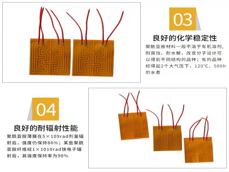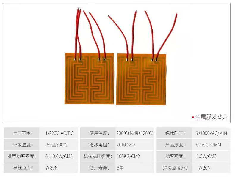 PI金属电热膜它是将特种金属箔制成各种电阻线路,然后封在两层绝缘薄片之间形成的电热元件。它是面状发热,热效率高,节能省电,升温快,热惯小。材质柔软,能使非平面的物体均匀受热。使用温度高,可达300度。使用寿命长,金属膜电热元件寿命为传统电热丝加热元件的10倍。无明火,安全可靠。温度控制,热惯性小。抗腐蚀性能强,热分布随意,可根据客户的要求开发设计各种形状、规格、电压及发热温度的电热膜,不受使用电压和温度的限制 。