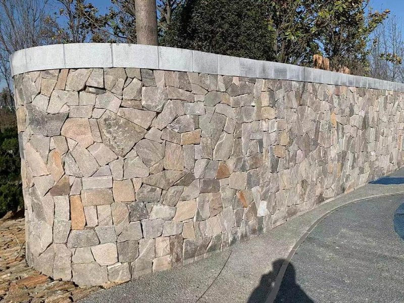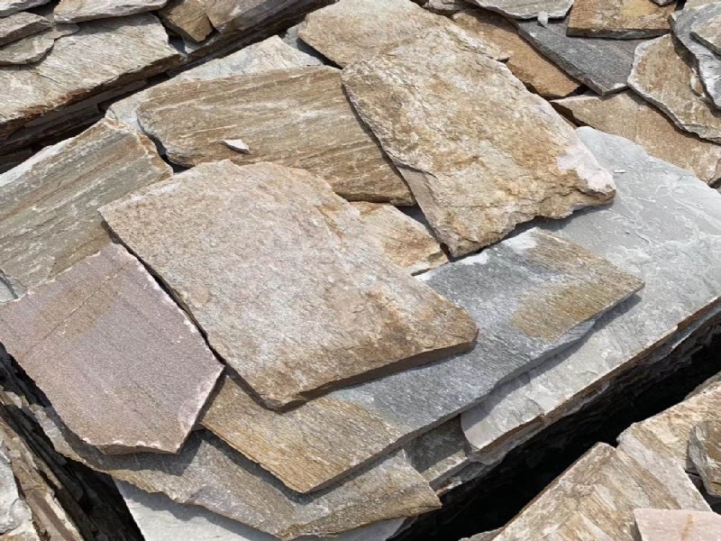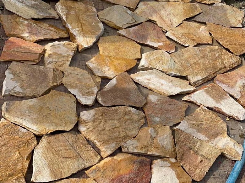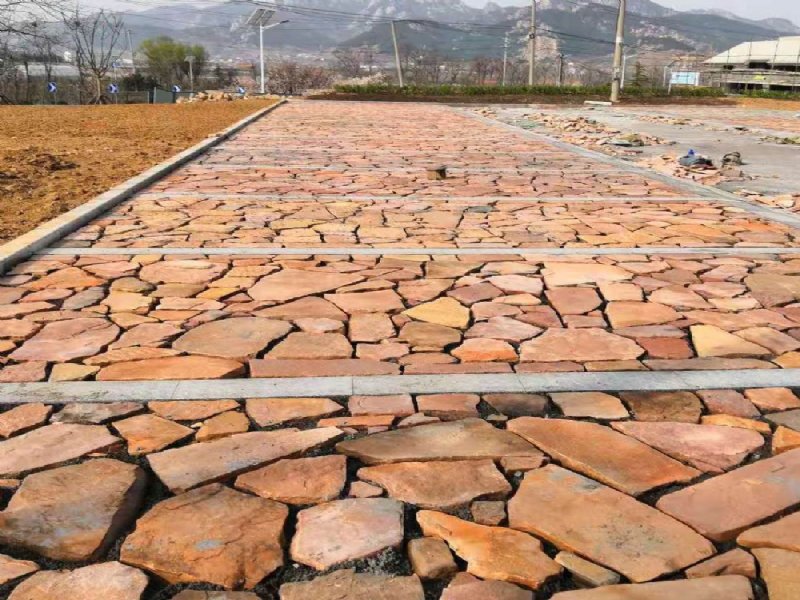 板岩石 是石匠工人用锤子将大块板岩石材方料敲成相应厚度碎块,有时候也用石材加工剩余的边角料,做成异形图案的铺装样式。在这种工艺条件下,板与板之间的缝是自然的,缝的大小也是不规则的,缝隙常为10 -50mm宽,碎拼石的施工工艺也分为勾缝与不勾缝两种。这种铺装方法在感官上比较粗矿、自然且富有野趣,常用于自然式园路或者小面积的广场铺贴。而冰裂纹,则可以理解为用锤子敲击一个完整的大冰块,内部产生许多条裂纹,这些裂纹的宽度较小且均匀,这种图案我们称之为冰裂纹。冰裂纹石材往往是由整块板材精密切割而形成的,因此,形式上比碎拼石的做工更为精致,也更上档次,但是加工难度较大,所以我们很难看到大面积的冰裂纹铺装。事实上,由于古代切割工艺的落后,所以将碎拼统称为冰裂纹。黄木纹碎拼石主要用于景观挡墙 别墅外墙粘贴.部分用于公园走廊 广场 庭院地面等.