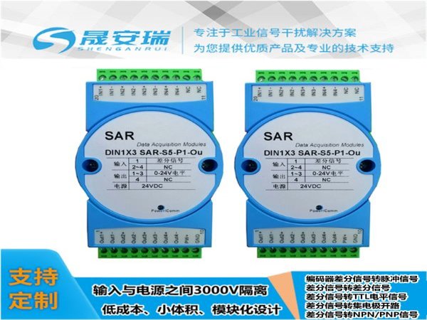 例 1: 输入:编码器差分信号输入; 电源:24V ; 输出:0-5V电平 型号:DIN3X3 SAR S5-P1-O1