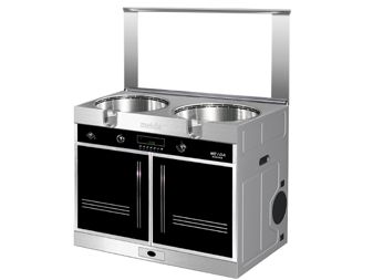 烤箱、消毒烘干、贮藏功能和人性化智能控制于一体,应用微空气动力学设计原理和独创全新概念的下排风工作方式,采用高速空气流体隔膜和深井侧吸等专利技术,提高吸油烟率,解决了长期悬而未决的厨房油烟污染和厨房