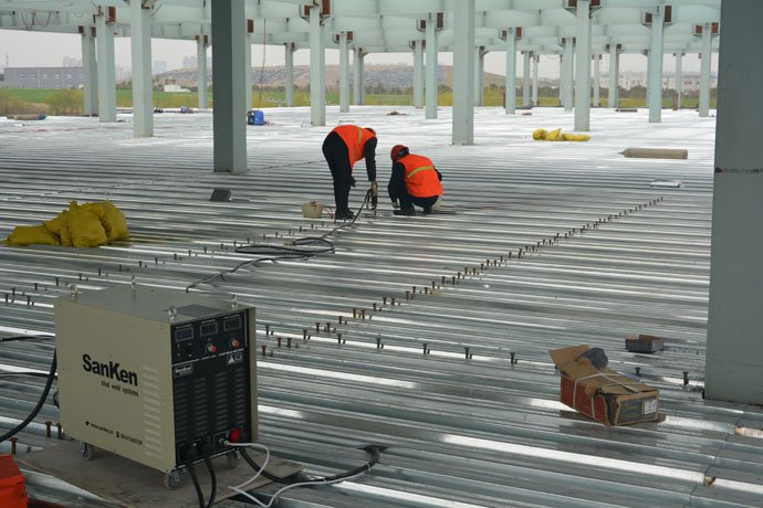 楼承板和焊钉(剪力钉)三者焊接为一体的栓钉穿透焊(穿过楼承板把煎力钉牢固地焊接在钢梁上,即钢梁、楼承板和焊钉同时融化形成混合熔融金属在焊*的作用下形成的焊接结点,相比较用打坡口用传统电
