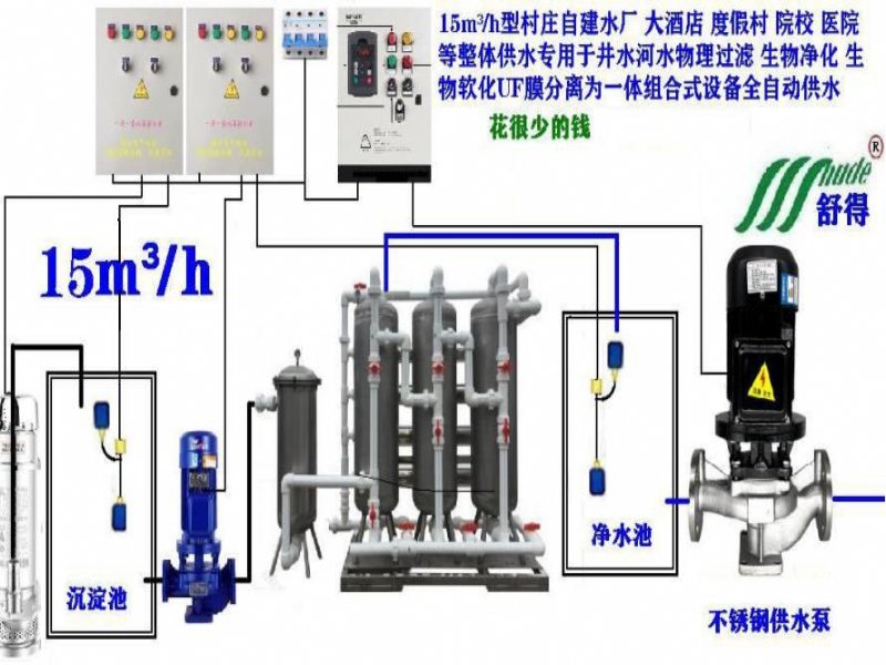 亮点⑦、水厂成套设备净水器规格可以从每小时3立方-5000立方的产水量,足以适合全国不同规模的中小型水厂配置了、每套净水器设备只需配备储水池一座和变频供水池一座即可,占地面积根据水池需要大小而定,