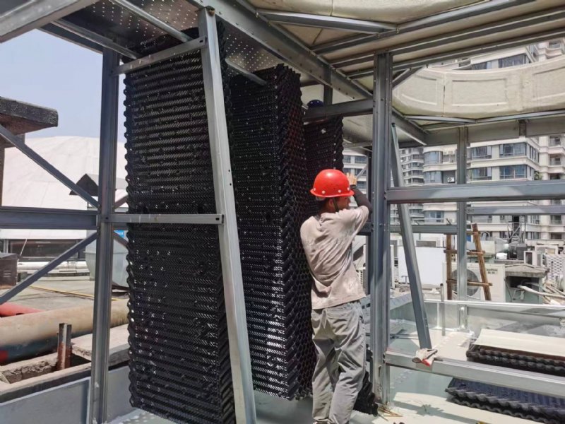 3、填充新填料。粘接或穿孔拼接冷却塔填料,并确保填料在