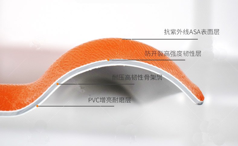 四层树脂瓦是采用ASA防腐抗紫外线面层+三层共挤技术生产而成,不仅完整保留以往树脂瓦的所有优点,还增强了树脂瓦的防开裂韧性,无疑给树脂瓦的使用耐久度又上了一道保险。
