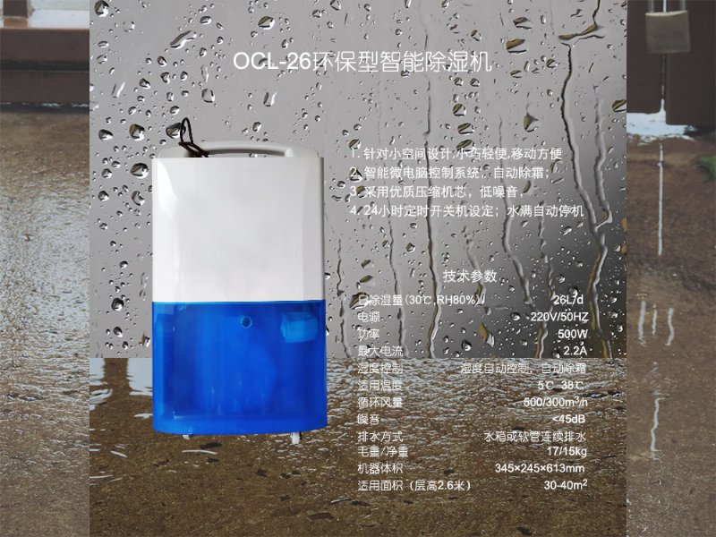 欧雷塞斯OCL-26L/56L/138L/192L系列除湿机,高效节能,鼓风除湿,能有效地将屋内湿气转化为液体,降低空气湿度,时刻保持屋内干燥,同时还可以改善环境空气质量,从而减少霉菌和其他病菌滋生,让你拥有一个干爽舒适的生活工作环境。