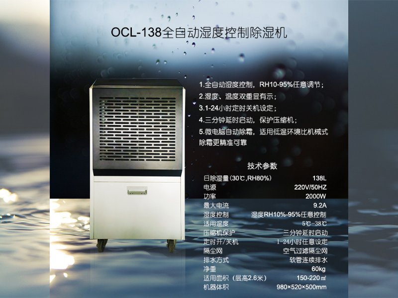 OCL-138全自动除湿机,温、湿度双重显示,微电脑自动除霜,功率大,除湿快,是一款低耗能高效率的产品,适用于各种湿度环境,可靠耐用。