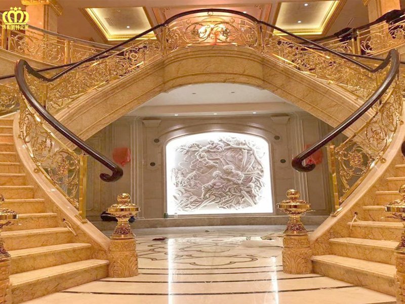 防护栏杆,更成为一种乎艺术设计的艺术作品。铜金色铜雕花护栏给人一种豪华的感觉、再和鲜艳的红色搭配在一起,就更显气和高雅了。金色红色的整体楼梯护栏颜色搭配给人的感觉是大气、高雅可以让整体的设计感更加的丰富,而且在视觉上会感觉到的豪华。你不妨尝试一下这种搭配。拉丝青古铜楼梯扶手艺术设计别墅