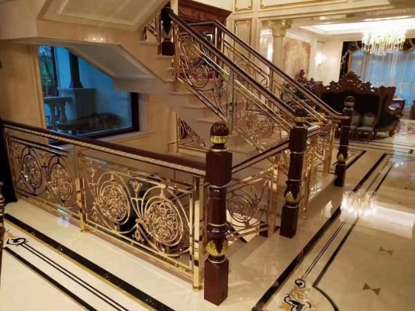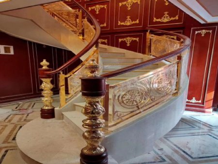 别墅铜楼梯护栏扶手由H62黄铜材料精雕细琢而成,整个工艺流程分成分成4个步骤。*一道工序是将不同规格的黄铜板选作雕刻形状款式的材料,用金属雕刻机雕刻出你想要的任意花式和图案,中国文化5000年流传下来的图案花型一般都有着不同的寓意,款式图案有 五谷丰登、龙凤呈祥、花开富贵、等一系列的款式可以选择,每个款式都对生活和未来有着美好的祝福和向往。第二道工序是精细抛光打磨,对铜材的表面每一个细节和缝隙进行360度的无死角抛光,依次用不同粗细程度的砂带打磨,先用80粗的砂带然后在用120粗的砂带再到240粗的砂带打磨,前面用这三种砂带打磨下来此刻铜材表面温度非常高,容易烫伤手,等待铜板冷却下来后,再继续用320/400/600/1000粗的砂带进行打磨,经过1000号粗的砂带打磨过后的铜材表面已经非常细腻,但是还没达到要求,*后还需要用麻轮配上紫蜡进行*后一次抛光,直至抛光到铜 材表面可以当镜子一样使用的镜面效果。第三道工序是把抛光好的所有铜材和配件都放到电镀池里面进行*后的表面处理,电镀的颜色也有很多种可以选择,分别有18k金、24k黄金、玫瑰金、青古铜、红古铜、黄古铜等颜色。*后一道工序就是对所有黄铜板材、管材、配件进行检查和组装。进过这四个工序制作出来的铜楼梯护栏铜扶手安装在高档别墅和酒店里面,将成为室内的一道吸引眼球和点缀了整个室内装修风景,提升了整套房子或者酒店的档次,显示出主人对生活的品味和对人生的追求,更加寓意着业主成功的象征。