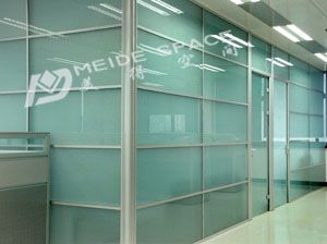 钢化玻璃内置百叶隔音、双层钢化玻璃隔间墙。(其中,双层钢化玻璃隔间墙又分为喷砂和不喷砂两种)