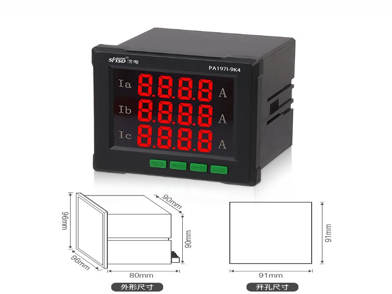 继电器输出、模拟量输出及通讯(RS485 MODBUS-RTU协议),提供多种不同的安装尺寸,可直接替代模拟指针电流表。
