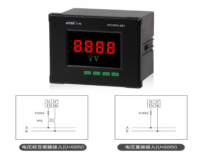 电压表采用交流采样技术,能分别测量电网中的电流、电压、功率、功率因数和电能等参数。可带RS485通讯接口/Modbus-RTU协议、模拟量数据转换、开关量输入/输出等功能,实现电力参数、电气元件工作状态的远程传输,便于后台