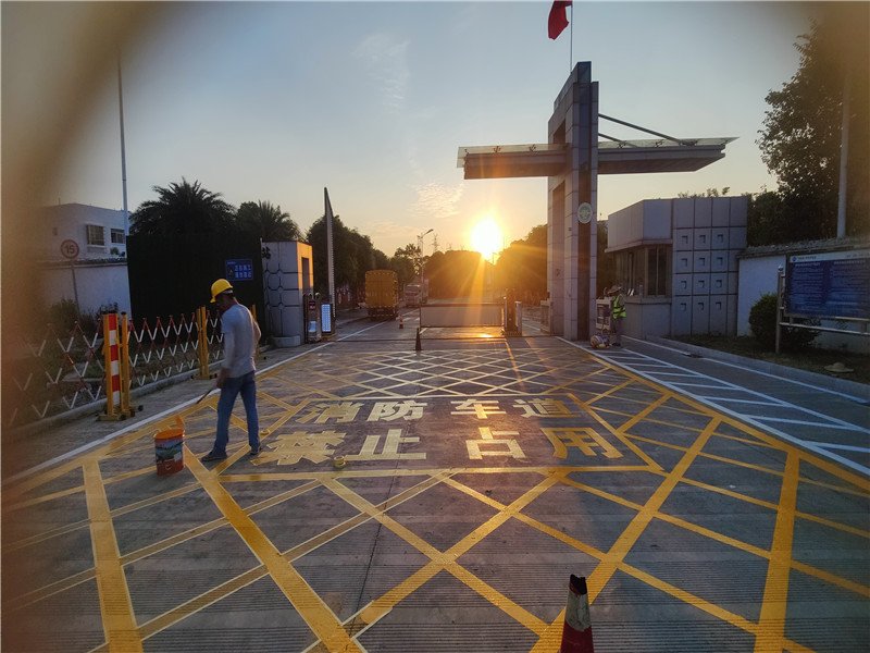 先是厂区大门道路划线消防通道标识,由于大门口是整个厂区的出入口,为防止其他车辆占用门口,大门地面宽度可划消防网格线,明显的黄线网格提醒作用强,然后进入厂区内部根据整个道路交通状况设置车行道,两边预留约2.5米的人行通道,施划斑马线,导向箭头,箭头规格有3M和5m区别,如果厂区内道路小于6m就设置单行道,中间划中心线,两边划道路边缘线。