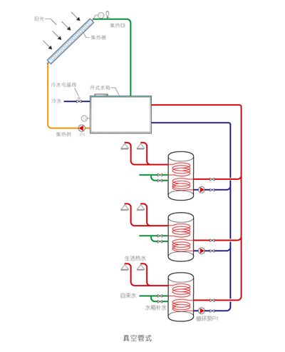 集中式太阳能集热系统图示(一次换热太阳能系统)