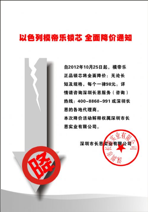 自2012年10月25日起,模帝乐正品锁芯将全面降价:无论长短及规格,每个一律98元。详情请咨询深圳长恩服务(咨询)热线:400-8868-991 或深圳长恩的各地代理商。