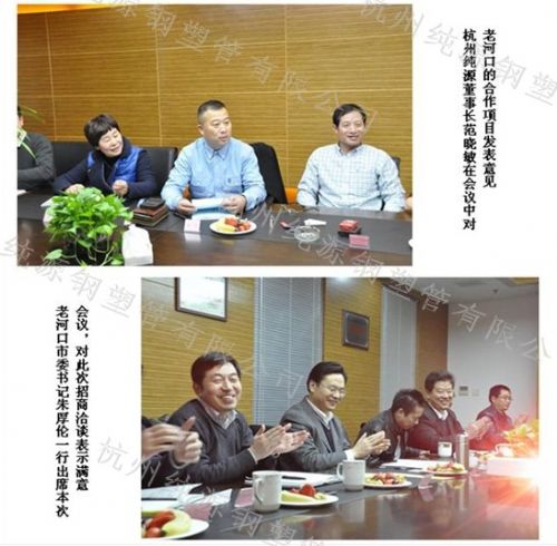 内容:元月20日下午,襄阳市委副书记、老河口市委书记朱厚伦带队赴浙江招商,拜访了本公司董事长范晓敏,就对襄阳市投资建设纯源钢塑管项目进行洽谈,并签订了投资2.7亿元的纯源钢塑管项目协议。副市长林国梁,市经济开发区、市招商局负责同志陪同。董事长范晓敏说,老河口产业基础好,双方合作的空间很大,愿意为老河口实现跨越式发展贡献力量。