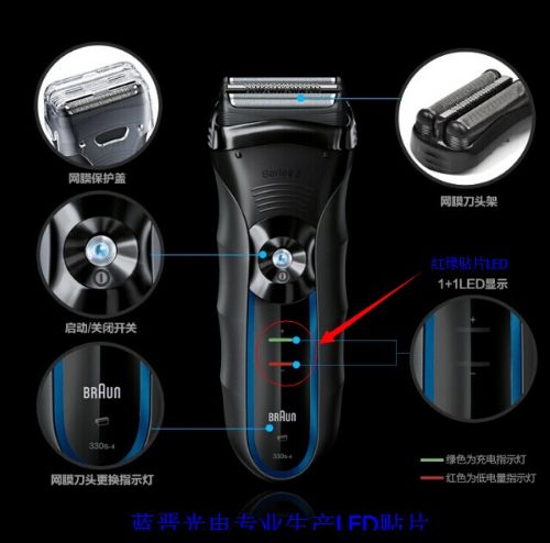 剃须刀外观组成由剃须刀头、几何刀网、剃毛刀头部件、开光按钮、正面护板、充电插口、LED显示、指示灯。由于每个品牌设计的不一样,用到的LED贴片型号颜色也不一样。一般充电指示灯用绿色贴片LED,低电量指示灯用红色贴片LED,LED显示用全彩贴片LED,全彩系列的贴片LED有3528RGB贴片LED、1206RGB贴片LED、5050RGB贴片LED、0603RGB贴片LED等。蓝晋光电专业贴片LED,双色LED,三色LED,全彩LED,020侧发光LED,背光LED,耐高温LED,抗衰减LED,贴片背光LED,抗衰减LED,耐高温LE,0603贴片LED,1206侧发光,3528红光,小蝴蝶红光,0805红光,0603侧面发光,335白光侧发光、侧发光等系列产品生产厂商。为此,蓝晋光电将继续在LED元件创造更优质