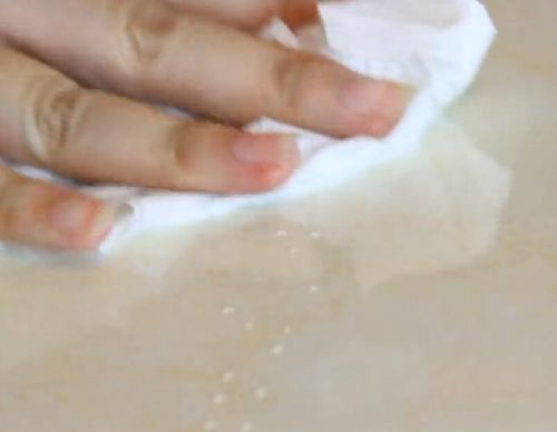 通过实验可以看到,油痕是成断珠状的,充分说明奥盟的扣板是不容易粘上油污的。